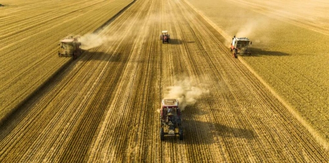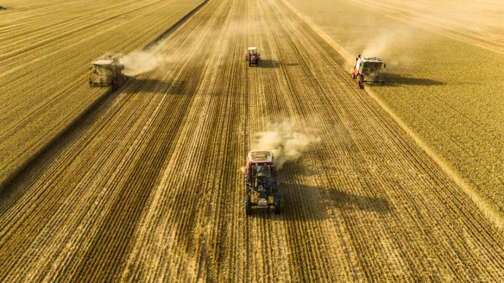 你是因为啥认识了河南是热气腾腾的烩面还是麦浪翻滚的麦田在河南省商丘市梁园区李庄镇潘堂村志诚种植农民专业合作社,农机手操作收割机、秸秆还田机、玉米精量播种机作业(无人机照片