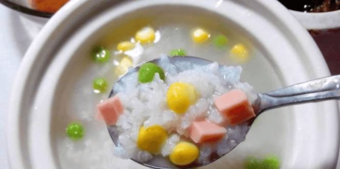 青豆火腿粥[材料] 火腿50克、青豆10粒、大米50克、高汤500 毫升。