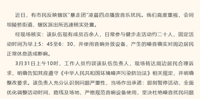 中新网4月1日电 据“杏花岭宣传微平台”微信公众号消息,太原市杏花岭区巨轮街道4月1日发布情况通报称,近日,有市民反映辖区“暴走团”凌晨四点播放音乐扰民。杏花岭区巨轮街道